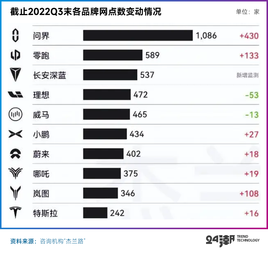 最新数据显示,截至11月28日,问界在220个城市拥有销售门店1168 家。对比新势力品牌小鹏(截至9月底)/理想(截至10月底)/蔚来(截至10月底)分别为 407、274、412 家,优势明显。官方预计 2022 年底问界品牌门店数量将拓展至 1200 家以上,扩张速度较快。