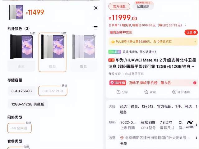 燃次元分别在华为官方商城、华为京东自营官方旗舰店、淘宝华为官方旗舰店搜索折叠屏手机“HUAWEI Mate Xs 2 512GB 锦白”,其中官方商城提示“到货通知”,另外两个电商平台均显示“无货”。