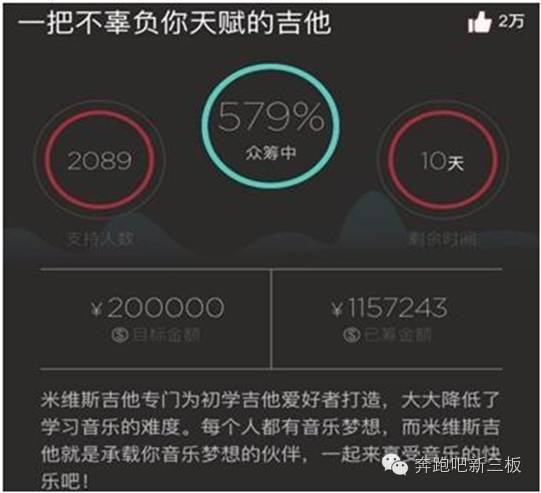 而另外一款为年轻人打造的吉他单品,米维斯吉他一度因音质与选材秒杀同档其余吉他品牌而在微博、知乎、微信、各大科技评测平台、音乐平台、乐器社区等形成广泛话题传播。其2016年7月京东众筹上线,12小时破京东115万记录,并登上了京东众筹首页,天猫店多次出现半小时内售罄的情况。