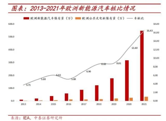 截至2021年,欧洲公共充电桩保有量仅为33.4万,公共车桩比为16.4:1;