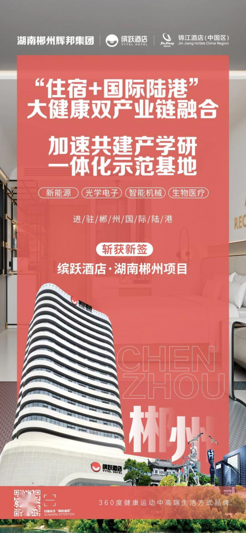引言:近日,锦江酒店(中国区)缤跃酒店与湖南郴州辉邦集团牵手达成战略合作,缤跃酒店正式进驻湖南郴州经济开发区。为推动“千亿园区”与“健康湖南”建设,提速健康产业跨界融合,打造了一面大健康住宿新兴支柱产业标杆旗帜。