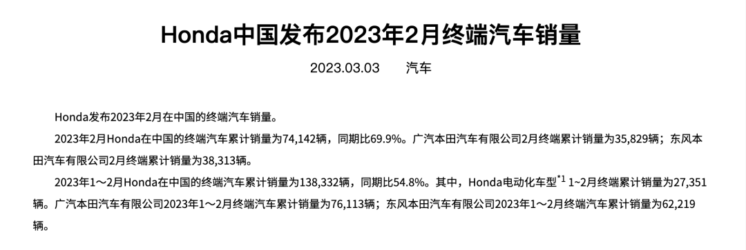 据本田中国最新公布的数据显示,今年头两个月(2023年1~2月)他们在中国市场的终端销量为138,332辆,同比下滑幅度高达45.2%,其中1月受春节假期的影响,同比下滑了56.2%,销量仅为64,193辆,而二月份的销量虽然回暖至了74,142辆,但同比下滑依然超过了30%。