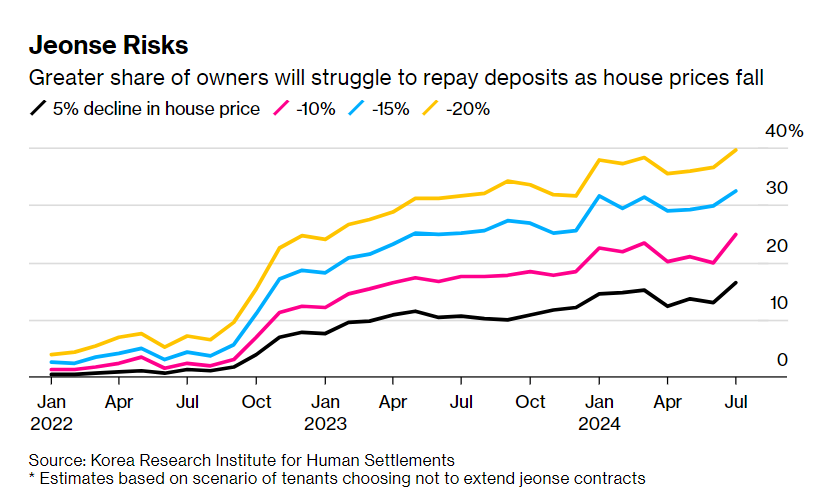 韩国人居研究院测算,如果未来房价下跌20%,那么,就有40%的房东返还不起房客的押金。