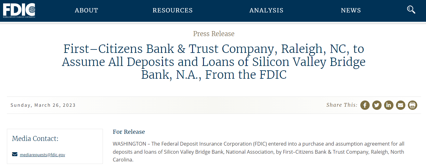 美国联邦存款保险公司(FDIC)3月26日发布声明,宣布第一公民银行就硅谷银行过渡银行(Silicon Valley Bridge Bank, N.A.)所有存款和贷款达成收购协议。硅谷银行过渡银行的17家前分行将于当地时间27日起以第一公民银行的名义开业。