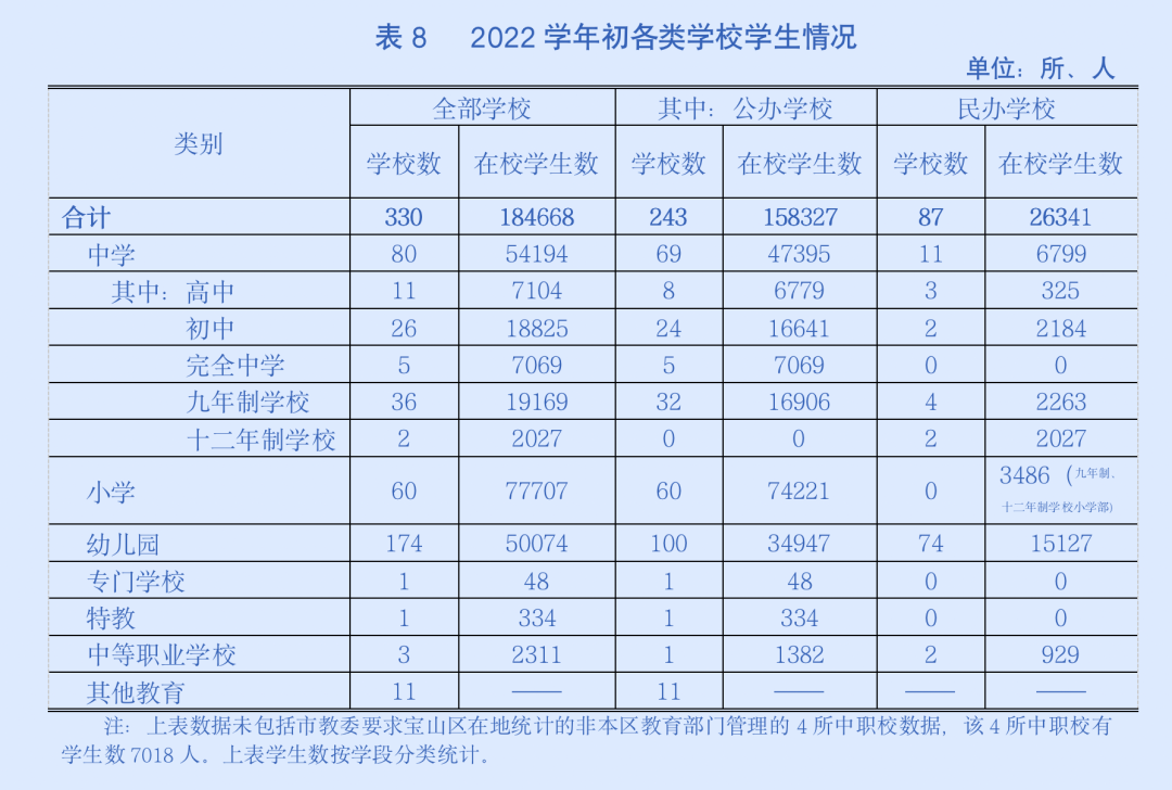 2022学年初,全区共有各级各类教育单位330家,在校学生近18.5万人,教职工近1.9万人。全年新开办学校(幼儿园)5所(其中公办高中1所、民办高中1所、公办九年一贯制学校1所、公办小学1所、民办幼儿园1所);撤销学校14所(其中民办小学9所、公办小学1所、成职教学校4所)。有更名学校8所(其中公办成人教育学校1所、民办初中1所、民办九年一贯制学校3所、民办幼儿园3所);另有3所学校调整学段并更名(其中2所公办初中转为九年一贯制学校、1所民办九年一贯制学校转为十二年一贯制学校)。与2021学年相比,我区中小学在校学生数持续高位增长,其中高中增长1539人,初中增长2517人,小学增长1787人;幼儿园在园幼儿总数量持续下降,较上年减少3434人。
