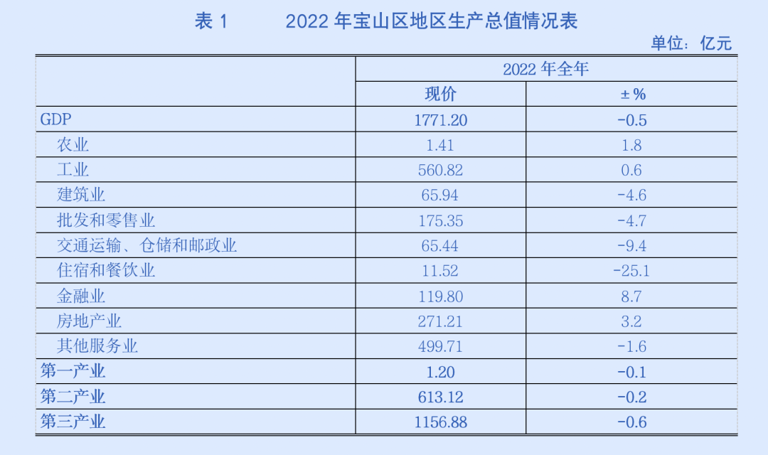 经初步核算,2022年宝山区生产总值(GDP)完成1771.20亿元,按可比价格计算,比上年下降0.5%。其中,第一产业增加值1.20亿元,下降0.1%;第二产业增加值613.12亿元,下降0.2%;第三产业增加值1156.88亿元,下降0.6%。三次产业增加值结构为0.1:34.6:65.3。