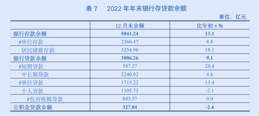 全年金融业增加值119.80亿元,增长8.7%。至年末,全区有银行26家,本外币存款余额5841.24亿元,比年初新增677.18亿元,增长13.1%;贷款余额3006.26亿元,比年初新增251.99亿元,增长9.1%;公积金贷款余额327.04亿元,比年初下降8.01亿元,下降2.4%。