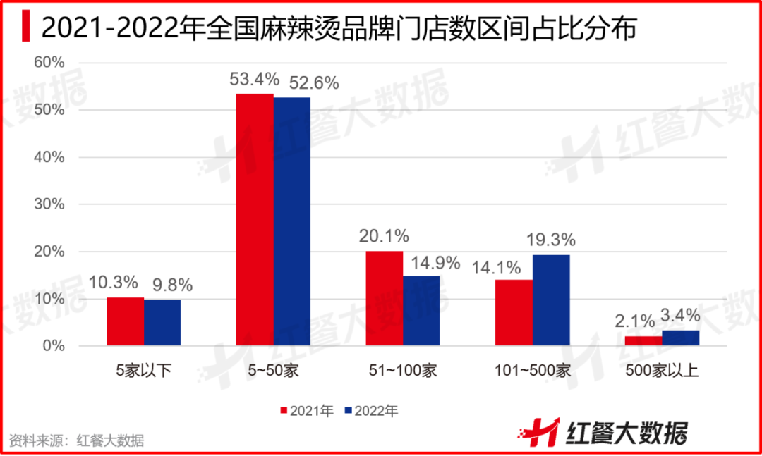 即便众多品牌门店数增长迅速,但总体来看,门店数超过500家的麻辣烫品牌依然寥寥无几。红餐大数据显示,2022年麻辣烫品类中,门店数在500家以上的品牌占比仅为3.4%。