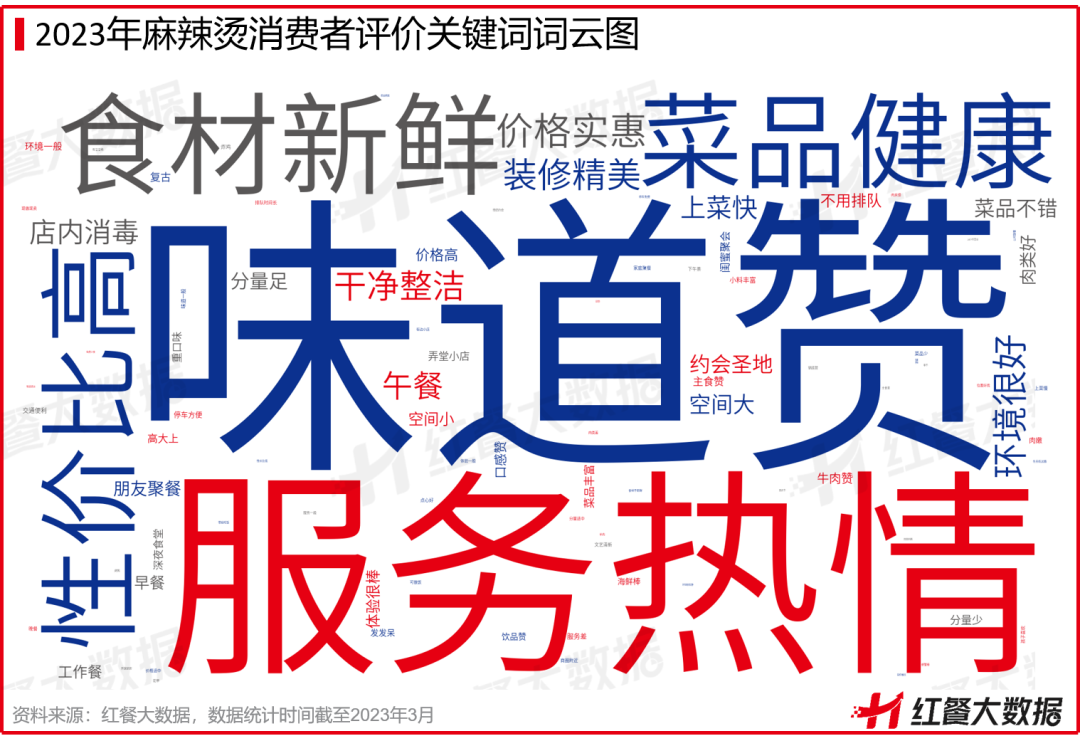 红餐大数据显示,在麻辣烫消费者的消费评价词频中,“味道赞”“服务热情”“食材新鲜”“菜品健康”出现的频次较高,其次才是“性价比高”“价格实惠”。可见,消费者对麻辣烫的关注度已经逐步从价格转移到食材以及体验等层面,对麻辣烫门店的食材品质和服务提出了更高的要求。