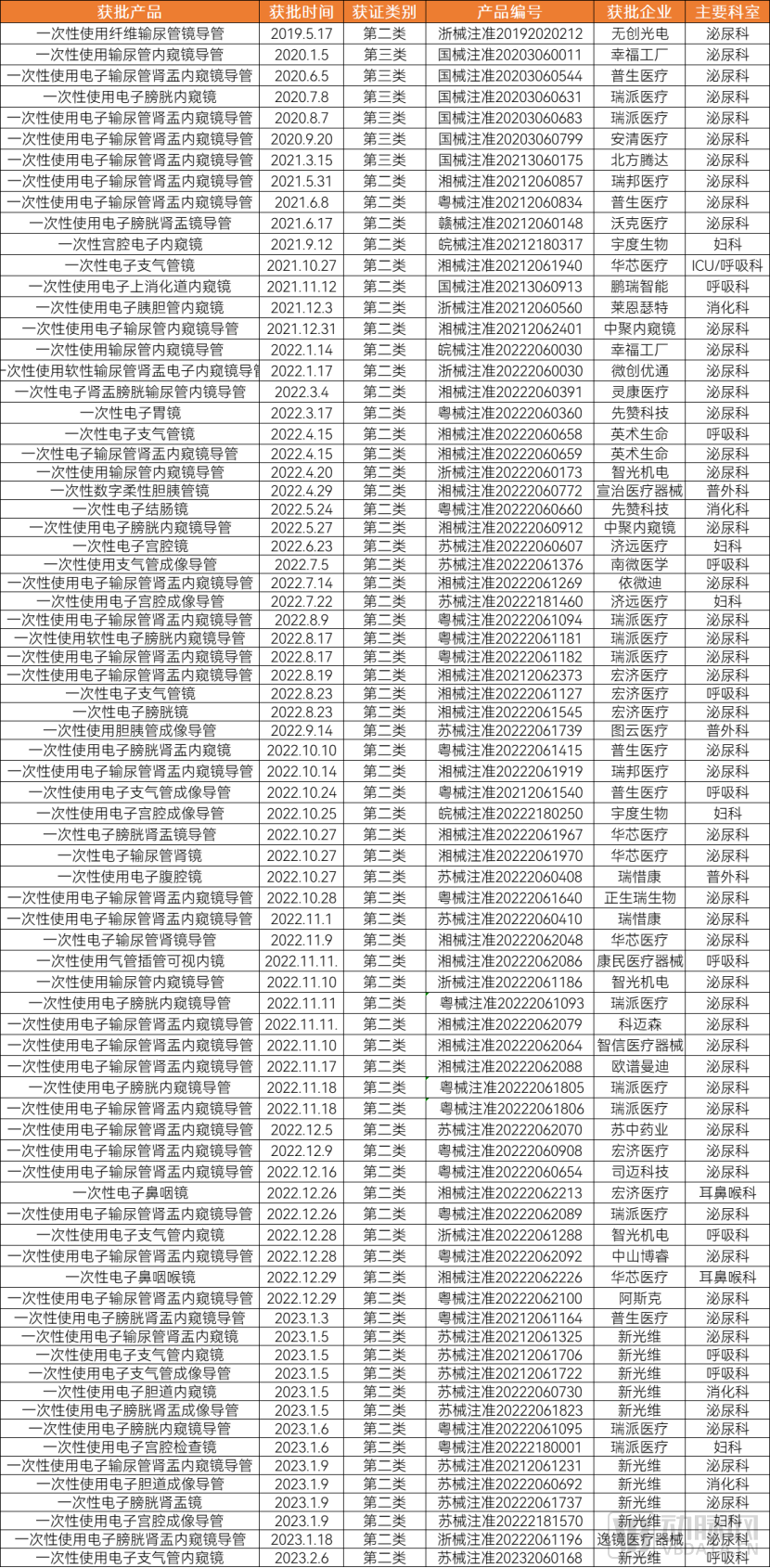 国产一次性内窥镜发展迅速,迎来大量获批产品。2010年前后,国内开始出现专注一次性的内窥镜企业,据不完全统计,截至2023年2月14日,行业已有近80款国产一次性内窥镜获得NMPA批准上市,而进口一次性内窥镜仅几款。