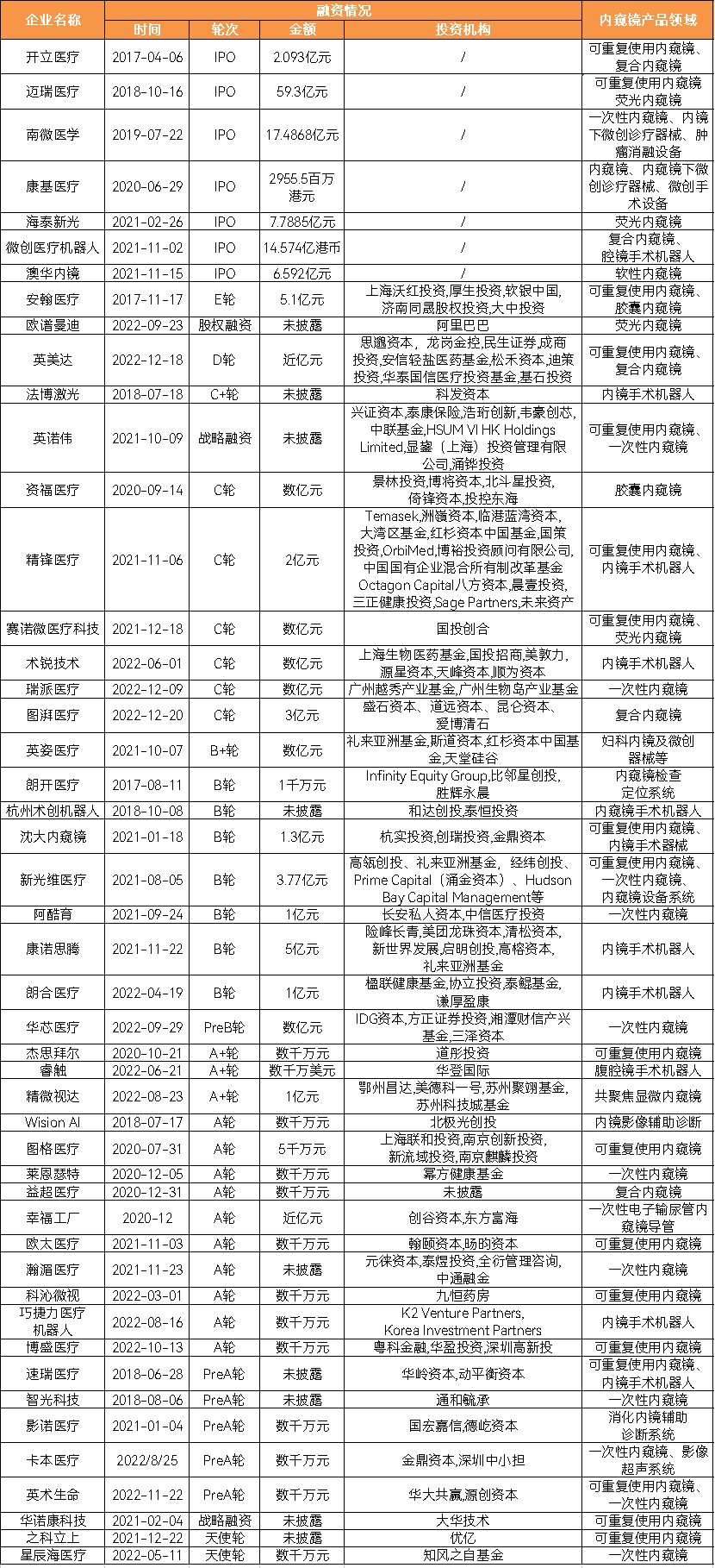 2017年至2022年医用内窥镜企业投融资情况盘点