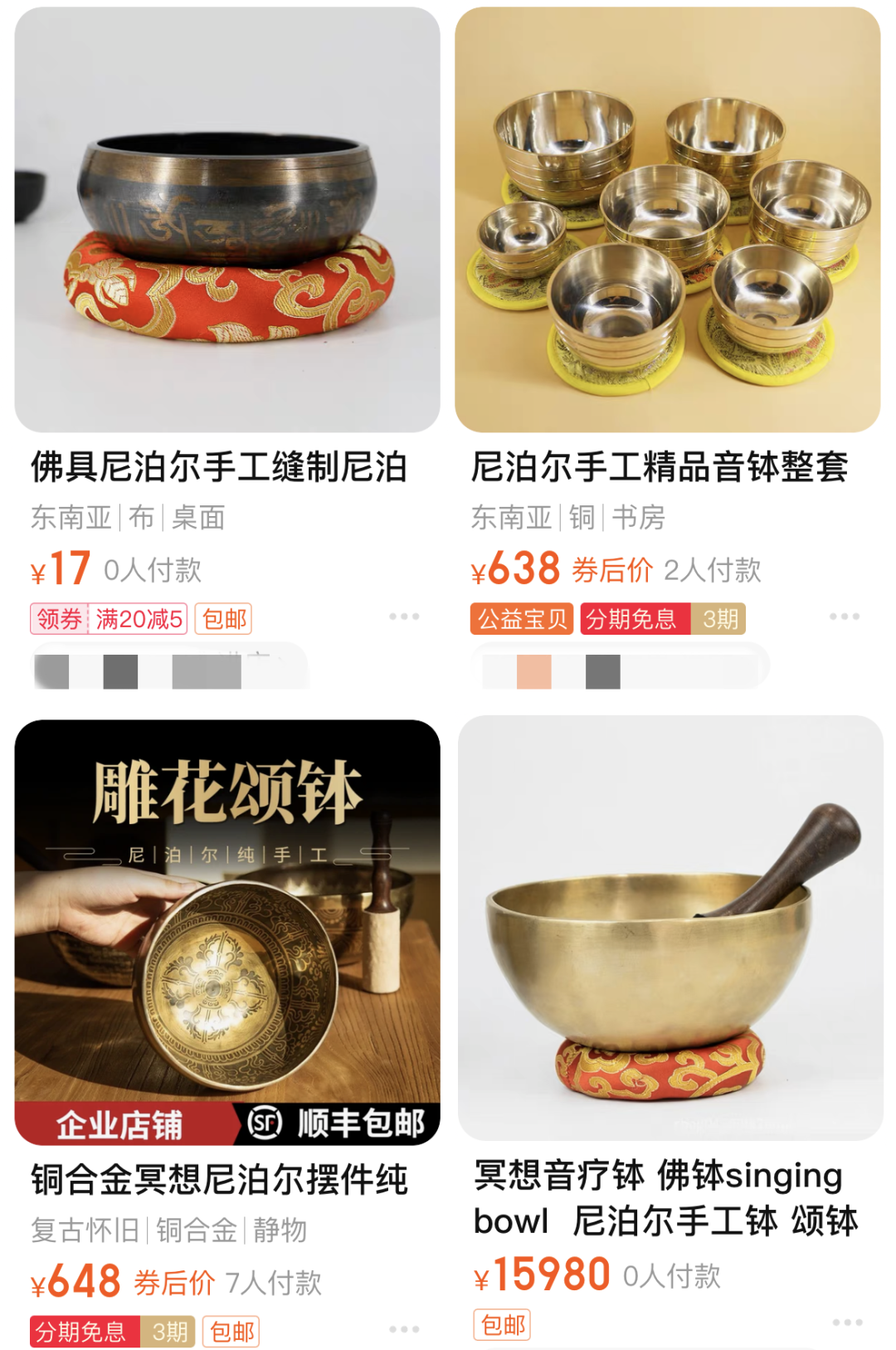 颂钵的世界到底有多复杂?在电商平台搜下颂钵,我们会看到一条崎岖的价格曲线,从17块钱延伸到15980块。再翻翻用户评论,又将见到一条围绕材质、产地、年份建起的鄙视链,最顶端的尼泊尔纯手工古董老钵傲视群钵。