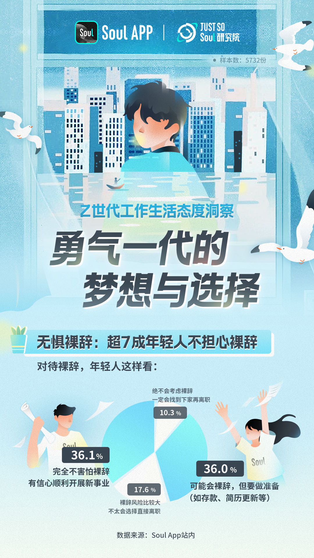 瞄准Z世代就业观和生活观新趋势,近日,Just So Soul研究院以社交平台Soul App站内用户为调研对象发起问卷调研,最终收回5700多份有效问卷。通 过整理与分析,Just So Soul研究院发布《Z世代工作生活态度洞察:勇气一代的梦想与选择》报告(以下简称“报告”),试图关注这群正对社会产生巨大影响的新兴群体,梳理更新Z世代的工作、生活画像。