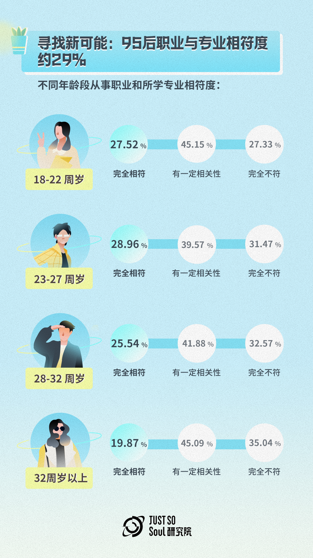 报告表明,95后从事职业与所学专业完全相符工作的占比为28.96%,这个数据在90后群体中为25.54%,而在90前群体(包括80后、85后等)则为19.87%。无论主动或被动,在不断成长中,年轻人们也在持续寻找全新的自我价值和真正的热爱,收获不一样的体验。