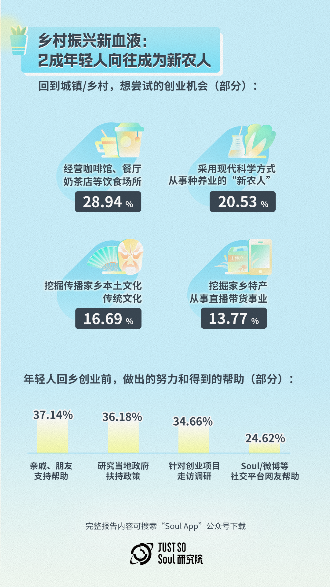 值得一提的是,在回乡创业前,年轻人们会研究当地扶持政策(36.18%)、并针对创业项目走访调研(34.66%)。在获得亲友的支持帮助(37.14%)外,还有24.62%的年轻人通过Soul等社交平台得到网友的帮助。在这些社交平台上,能看到当代年轻人因兴趣和热爱相遇,积极交流,分享新知识、新技术、新机会以及乡村的新面貌,在互助中并肩携手、共同成长,正如一位回乡创业的Soul用户所说,“正是平台上其他用户的帮助和支持,给了我人生新开场的勇气”。