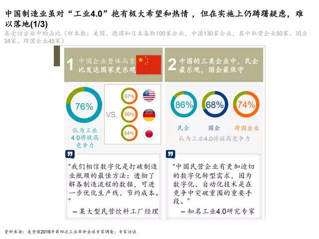 为全面了解中国企业的数字化运营现状,麦肯锡访问了130位来自各行业的企业代表。调查显示,中国制造商对工业4.0抱有极大的热情和期待(见下图),比美、日、德企业更为乐观:76%的中国受访企业相信技术革命将增强自身竞争力,远高于美、德、日三国(美57%,德50%,日54%)。