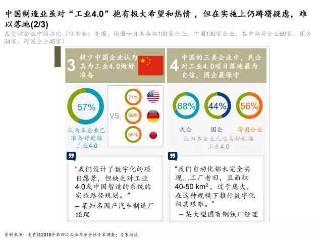 虽然中国制造商对工业4.0抱有很大的热情和期望,但对实施具体策略有较多疑虑。只有57%的中国企业对工业4.0做好了充分的准备,远低于美国(71%)和德国(68%)。