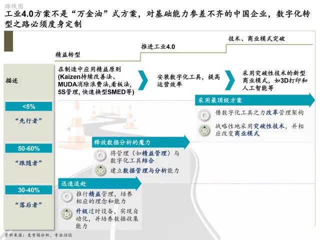 中国制造商能力参差不齐,现状复杂。要在数字化转型中成功获取最大的价值,需要的不是“万金油”式的解决方案,而是基于公司个体能力与业务需求量身定制的工业4.0路径(见下图)。