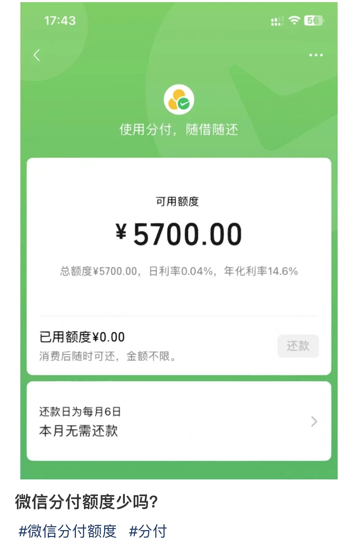 据了解,分付属于典型的消费信贷和信用支付产品,不同于“花呗”的40天免息期等规定,分付计息方式均按天计算,日利率为0.04%(年化利率14.6%),使用后可随时还任意金额。分付可以分期还款,不需要用户主动选择分期,每月默认还上月末已用额度的10%和利息。逾期超期一定时间后,微信支付将被限制使用。