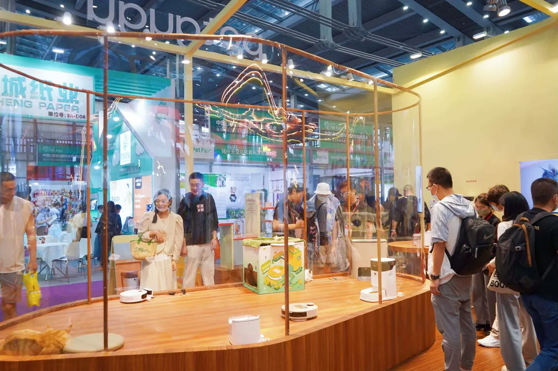 petgugu展台采用开放式设计,温馨的配色方案呈现温暖、自然和时尚的氛围,中央设置沉浸式产品体验区,同时也是智能居家养宠空间的再现,旨在为观众带来真实的人宠互动体验,独居美学特色的展场造型和优质产品吸引了众多观众驻足了解并体验。