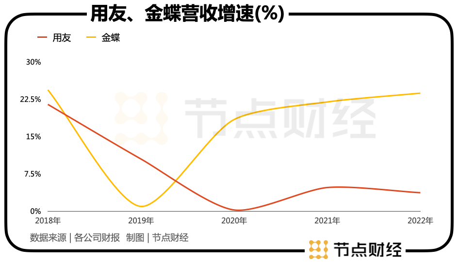 拉长时间轴,2018-2022年,用友的营收从77.03亿元增长至92.62亿元,金蝶的营收从28.09亿元增长至48.66亿元。较为不易的是,在异乎寻常的这五年间,两家公司每年都有程度不一的进步。