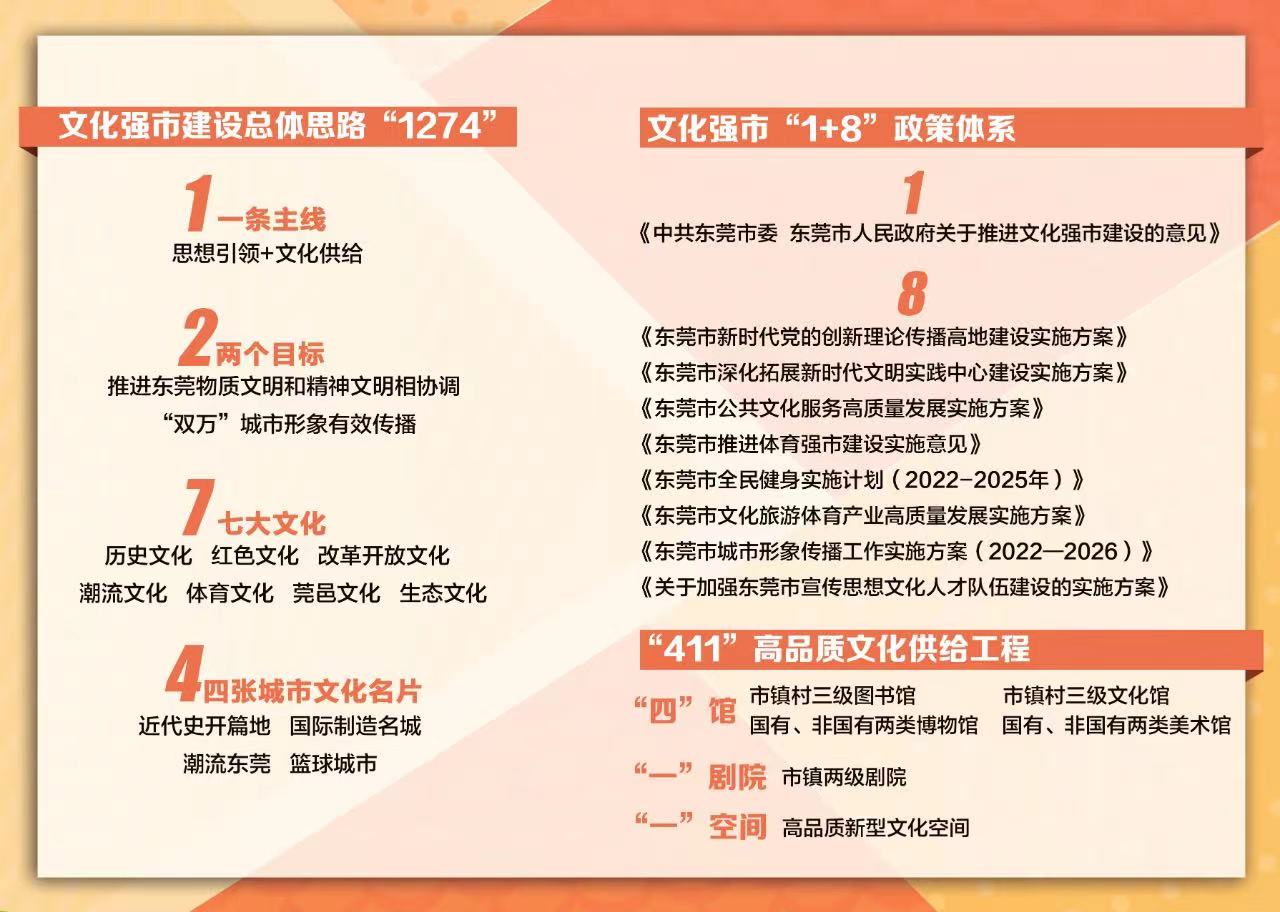 今年3月,东莞高调召开文化强市建设大会,明确文化强市“1274”总体思路和“1+8”政策体系,未来东莞将打造“411”高品质文化供给工程、“十大文化品牌”“十大文体设施”、城市标识等重大项目。
