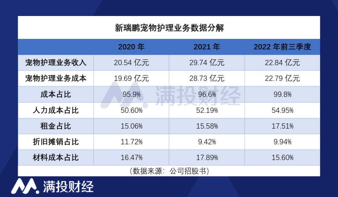 通过新瑞鹏3月14日更新的招股书可以看到,2020年-2022年报告期内,新瑞鹏各年分别实现营收30.08亿元、47.84亿元、57.40亿元,年均复合增长率为38.13%。其中宠物医疗服务占总收入的“大头“,近三年都为新瑞鹏的总营收贡献了一半及以上的收入。