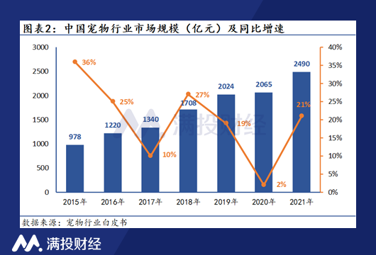 根据宠物行业白皮书的数据显示,我国宠物消费市场规模从2015年的978亿元扩大至2021年的2490亿元,年复合增长率高达16.8%。随着当代年轻人的精神压力越来越大,人们开始在宠物身上寻求陪伴和抚慰,中国的宠物行业市场规模不断扩大,并且处于高速发展态势。
