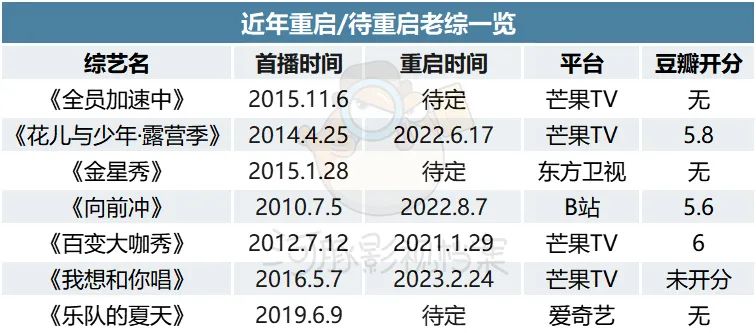 “现在做综艺,大家会去豆瓣或者微博看舆情,如果某档节目被复活的呼声很高,那就会考虑重启。”阿苏表示,除了部分家大业大的平台,重新做一档新的、市场反馈未知的节目风险太高,尤其是这几年连续综艺小年,综艺人更倾向于求稳,重启有群众基础的老综也在情理之中。