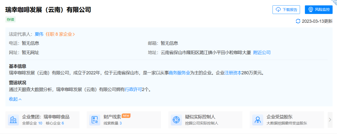 周天财经于天眼查上查到,瑞幸咖啡发展有限公司于 2022 年在云南成立,主营业务为咖啡豆种植、食用农产品初加工、农副产品销售等。同年瑞幸精品咖啡「小黑杯」出现主打云南咖啡豆的新产品。向原料、加工端紧逼,成为饮品连锁品牌控制成本的主要手段。