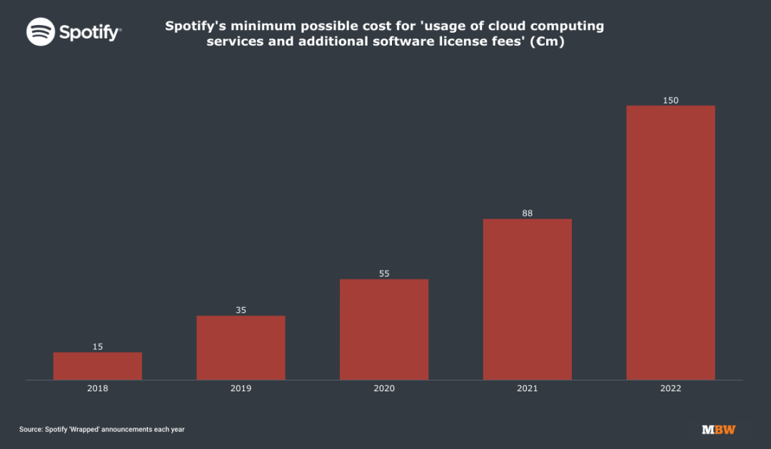 据MBW报道,2022年,全球音乐流媒体服务平台上总共有1.58亿首曲目,其中42%,即6710万首曲目播放量小于等于10次;24%的歌曲,即3800万首曲目完全没有被播放过。与此同时,Spotify托管这些歌曲的云服务费用却可达到9位数,相当于托管费用中接近一半都打了水漂,还听不见响。