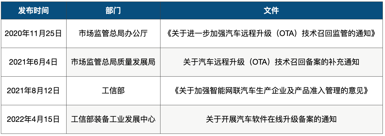 2020年11月,市场监管总局办公厅发布《关于进一步加强汽车远程升级(OTA)技术召回监管的通知》,次年6月又发布一则补充通知。