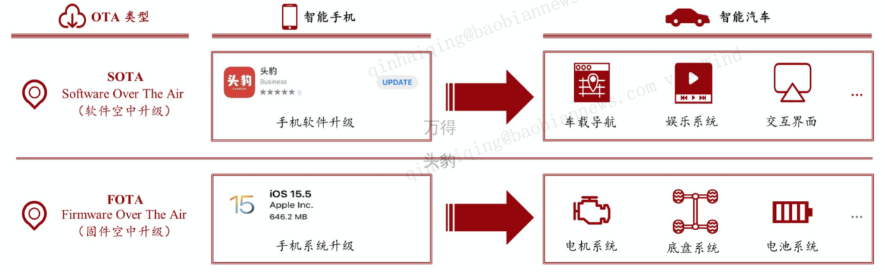 所谓OTA,全称Over The Air,直译“空中更新”,即通过无线网进行远程升级的技术,这项技术并非专属汽车,PC时代就已出现,后盛行于智能手机行业。
