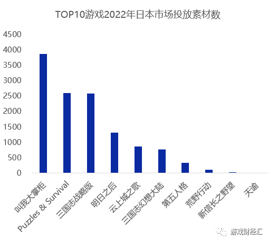 从投放素材数来看,广州厂商出海日本收入榜TOP10,《叫我大掌柜》《Puzzles &Survival》《三国志战略版》等老游戏投放相对强势,《云上城之歌》《三国志幻想大陆》等新游较为佛系。