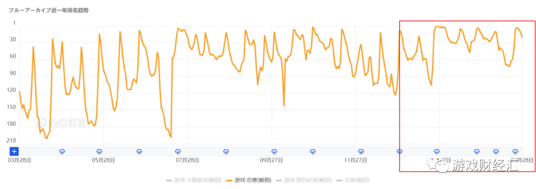 图:《Blue Archive》在日本市场最近一年排名情况;来源:点点数据