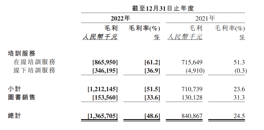 基于对外界环境变化的敏锐判断,粉笔在2021年开始调整布局,收缩线下业务,此项举措在2022年逐渐收效。报告显示,粉笔的线下培训毛利率由2021年的-0.3%增至2022年的36.9%,毛利润由亏损491万元增至盈利3.46亿元,同步实现了扭亏增盈。