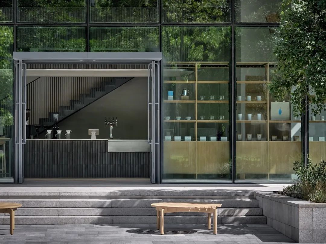 喜欢开在老建筑、旧仓库、工厂车间的蓝瓶,在上海的第二家门店,是一家商场店,简约质朴。