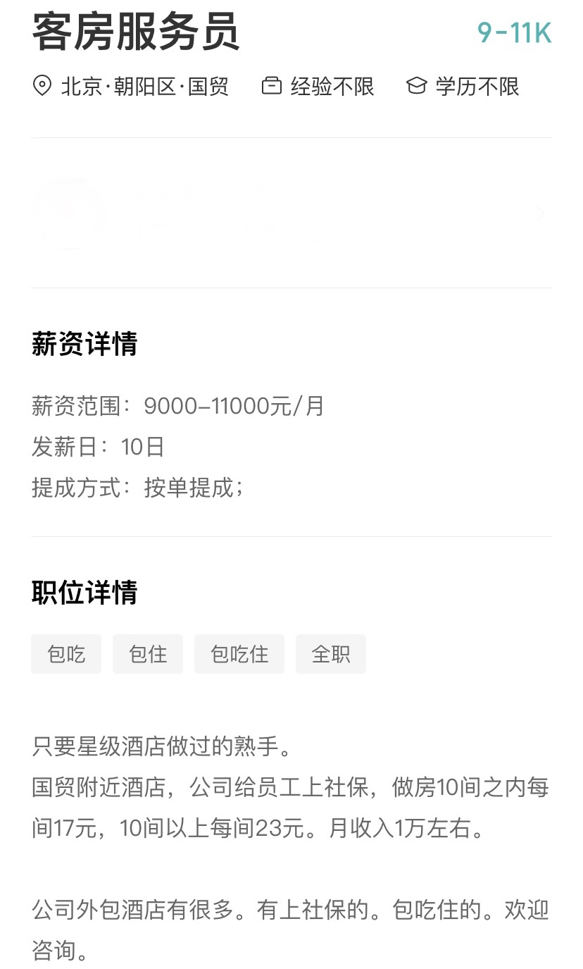 根据北京市人力资源和社会保障局的报告显示,北京2022届本科毕业生月薪集中在6500元至8000元,硕士及以上学历毕业生月薪集中在7000元至9000元。也就是说,招聘软件上这则星级酒店客房服务员的工资,已经超过了大部分北京应届研究生的月薪。