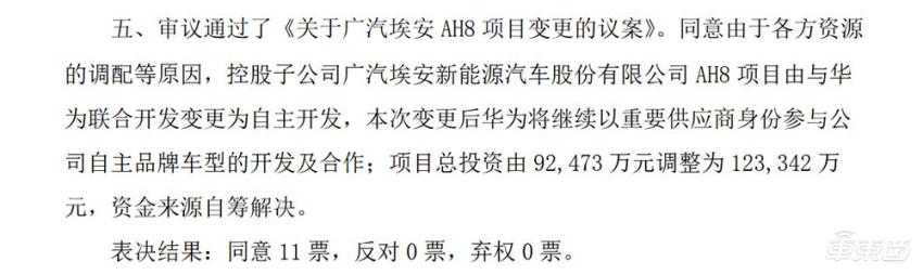 3月27日晚,广汽集团董事会通过了《关于广汽埃安AH8项目变更的议案》,由此广汽埃安AH8项目由与华为联合开发变更为自主开发。根据该公告,本次变更后华为将继续以重要供应商身份参与公司自主品牌车型的开发及合作。