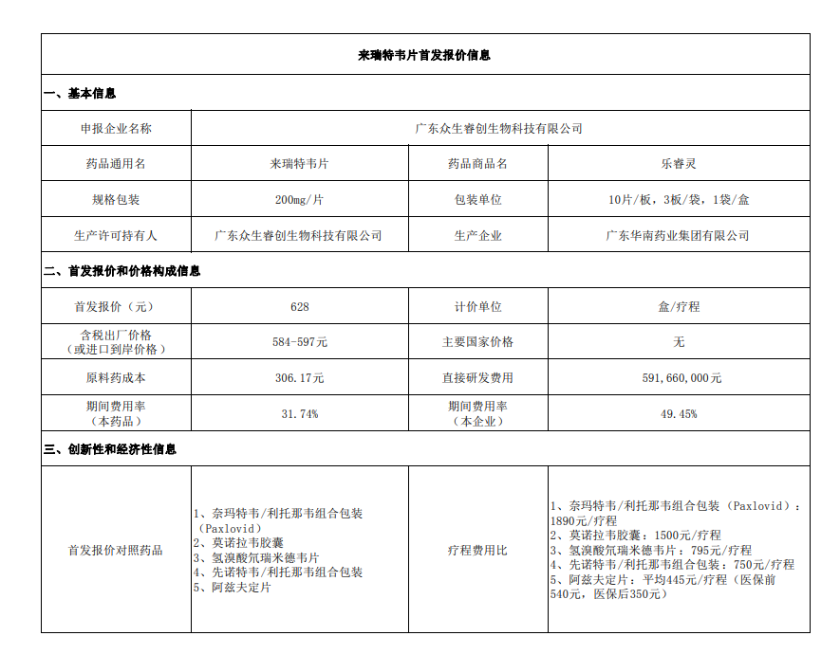 3月28日,上海市医保局官网披露,广东众生睿创生物科技有限公司的新冠口服药来瑞特韦片(商品名:乐睿灵)首发报价为628元/盒/疗程。