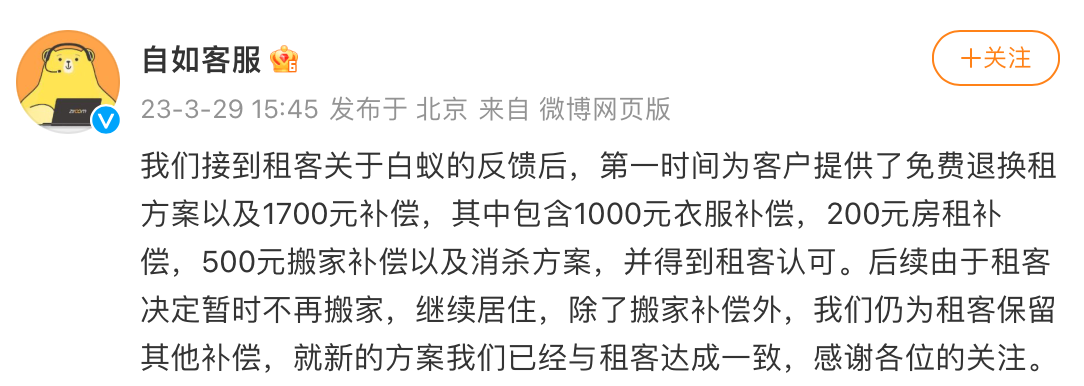 3月29日,@自如客服 就“男子租房发现大量白蚁”一事发文回应称,已为客户提供了免费退换租方案以及1700元补偿,其中包含1000元衣服补偿,200元房租补偿,500元搬家补偿以及消杀方案,并得到租客认可。后续由于租客决定暂时不再搬家,继续居住,除了搬家补偿外,仍为租客保留其他补偿,就新的方案已经与租客达成一致。