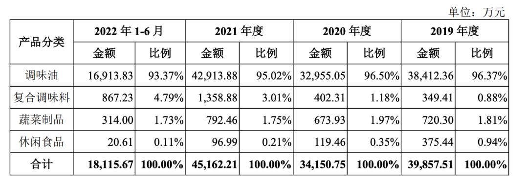 数据显示,2019-2021年及2022年上半年,幺麻子的调味油收入分别为3.84亿元、3.3亿元、4.29亿元和1.69亿元,占比分别为96.37%、96.50%、95.02%和93.37%。报告期内,该公司来自主要产品藤椒油的收入占主营业务收入的比例在80%以上。