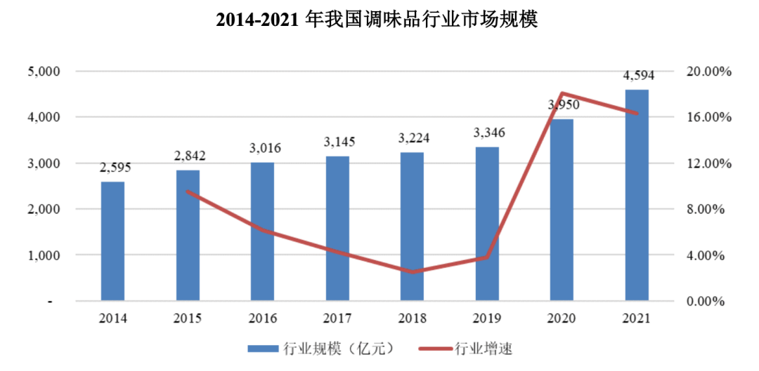 根据艾媒咨询数据显示,2014-2021年,我国调味品行业市场规模从2595亿元增长至4594亿元,年均复合增长率为8.5%。受疫情居家影响,2020年、2021年,我国调味品行业市场规模同比增长18.05%、16.3%。