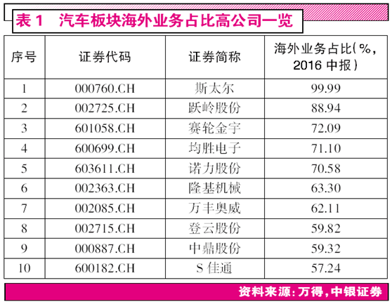 中银国际的汽车行业研究报告分析,在人民币贬值的大背景下,进口汽车价格吸引力将下降,国内合资车企中、高档车的价格竞争优势将凸显。人民币贬值也将增加出口汽车与零部件价格竞争优势,利好以出口为导向的汽车与零部件企业,建议关注海外收入占比高(表1)、外币借款少的公司。