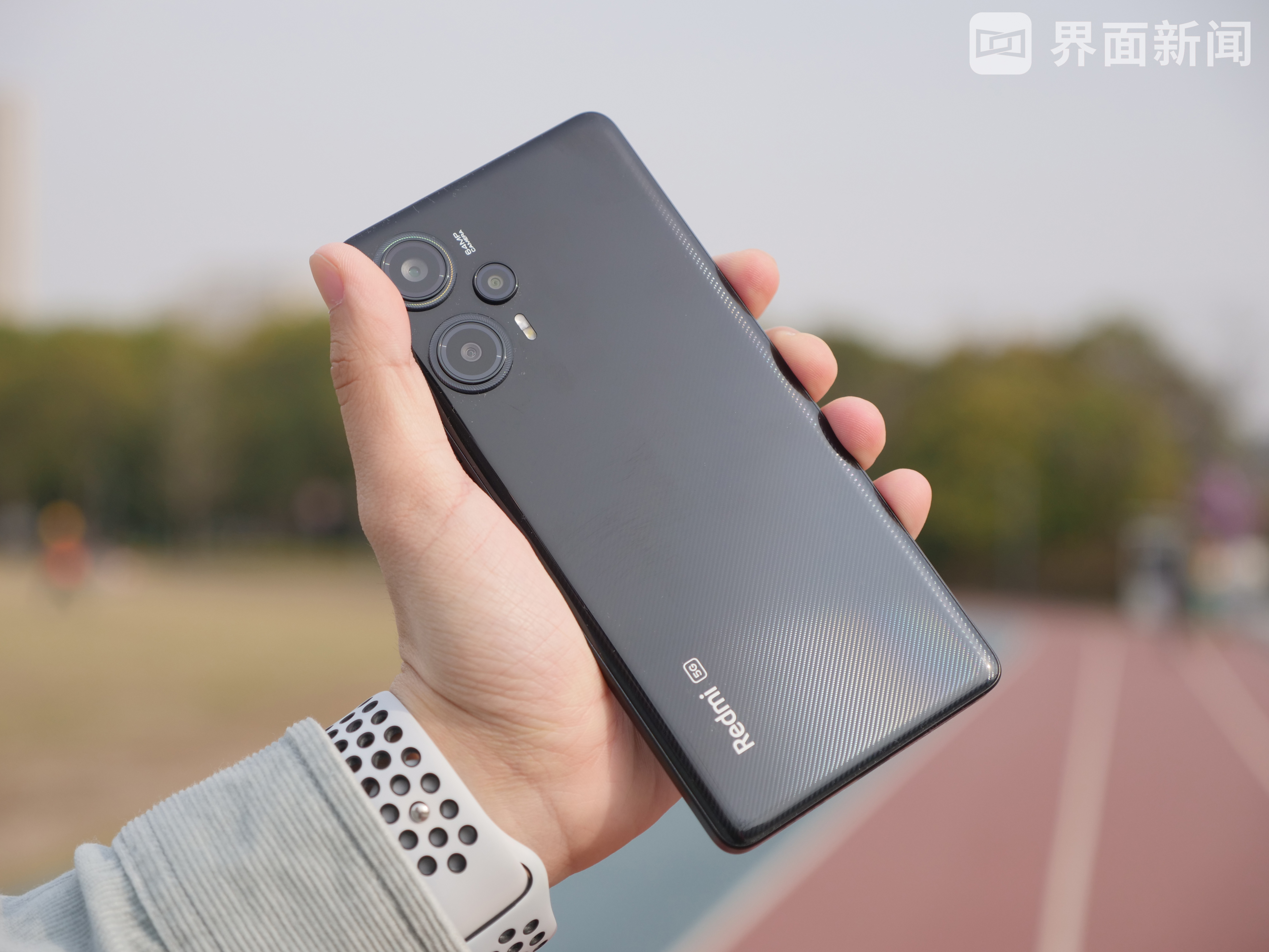 本次新机共有三个版本,分别为碳纤黑、星海蓝、冰羽白。我手头的这台为碳纤黑版本,颇有赛道感的后盖更加贴合“Turbo”的名字。新机重约为181g,厚度也下降到了7.9mm,加上无屏幕支架设计,因此握持感属于轻薄类型。