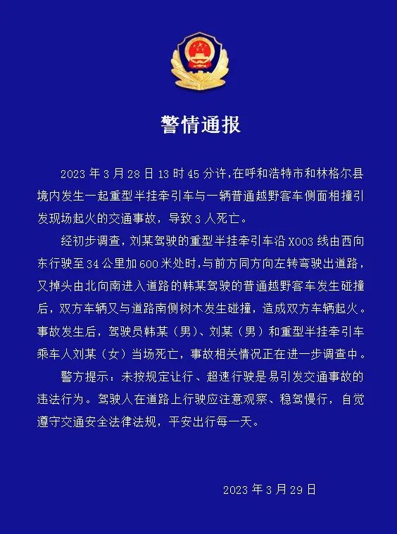 呼和浩特市交管支队3月29日晚通报,3月28日13时45分许,在呼和浩特市和林格尔县境内发生一起重型半挂牵引车与一辆普通越野客车侧面相撞引发现场起火的交通事故,导致3人死亡。