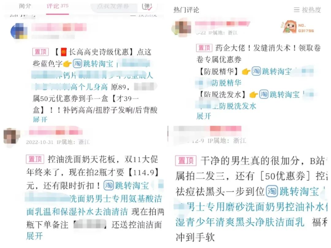 视频下方置顶第一条就是广告链接,大量水军在评论区好评。大到B站粉丝量60多万的博主,小到只有两位数粉丝量的素人都存在这类现象。