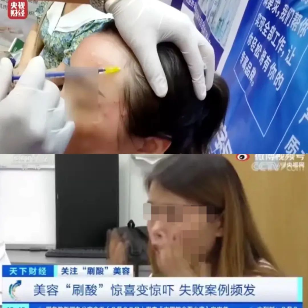 △(315晚会被曝光的不可注射美容针、女孩刷酸毁脸/图源网络)