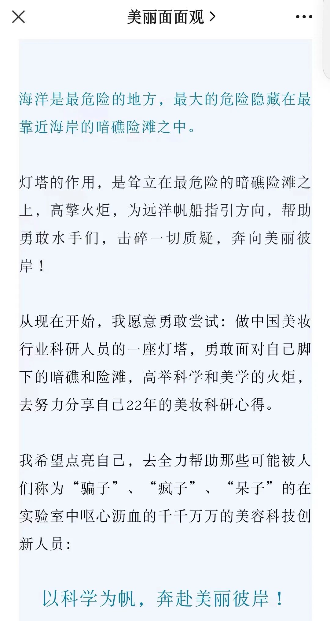 据了解,陈迪正在开展“灯塔计划”,全力帮助那些可能被别人称为“骗子”、“疯子”、“呆子”的在实验室呕心沥血的千千万万的美容科技创新人员。