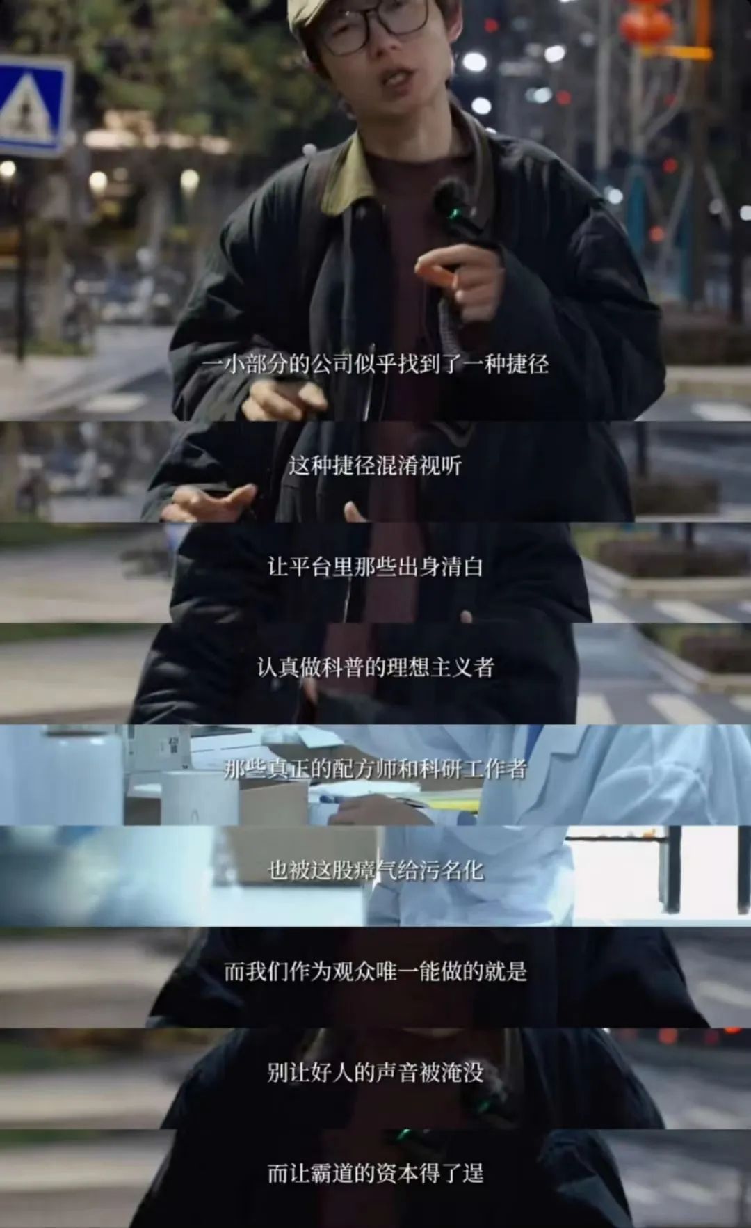 作为曾经的导演专业大学教师,四火熟练掌握各种拍摄手法,也熟知什么样的题材和方式可以调动观众的情绪。他或许巧妙利用短视频形式放大了矛盾,是想吸引更多群体的关注,期待有人能为科学做点事。又或许能给市场一点鞭策作用——有则改之,无则加勉。